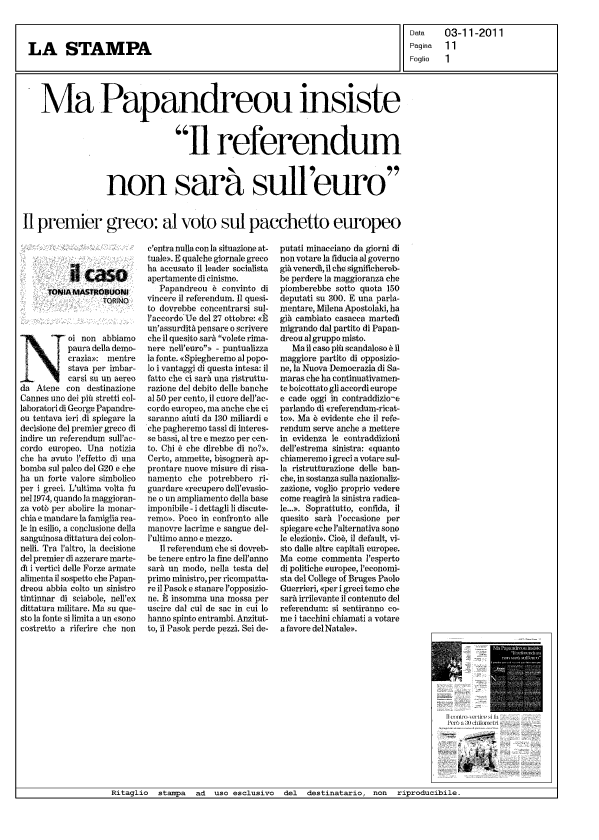 -      Ma Papandreu insiste. Il referendum non sara’ sull’Euro